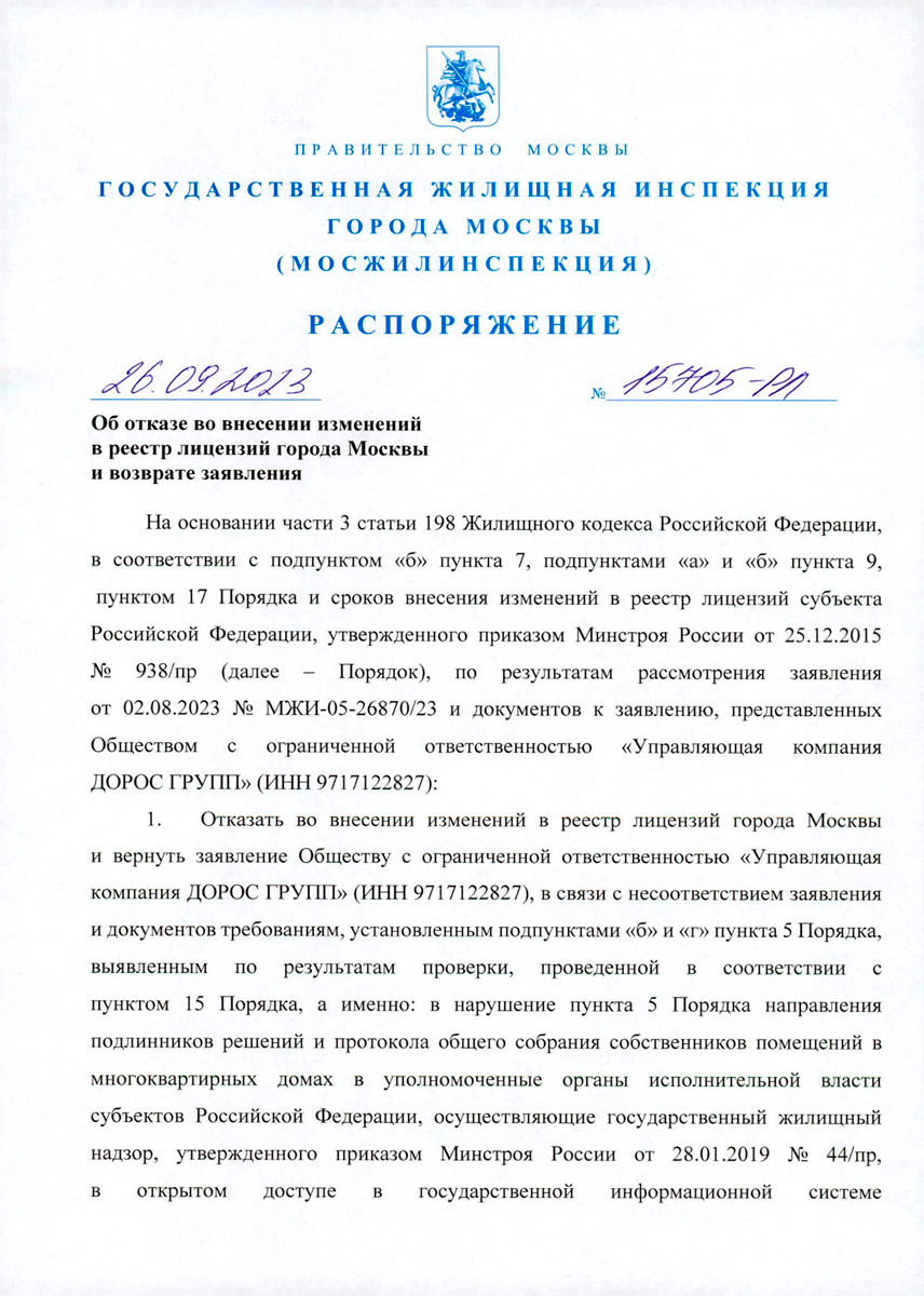 Отказ от 26.09.2023 Мосжилинспекции ДОРОС ГРУПП