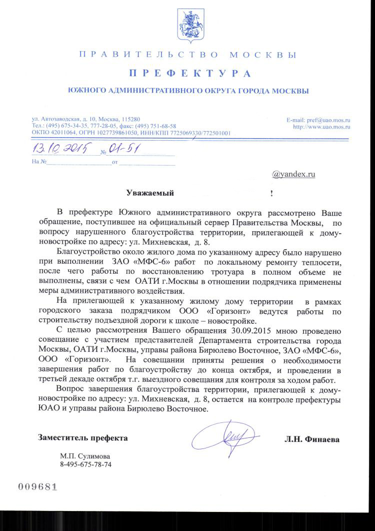 На мое обращение от сентября 2015 года по поводу трубы вокруг нашего дома (портит вид нашего дома, мешает доступу к дороге по Михневской улицы) мне был дан ответ: