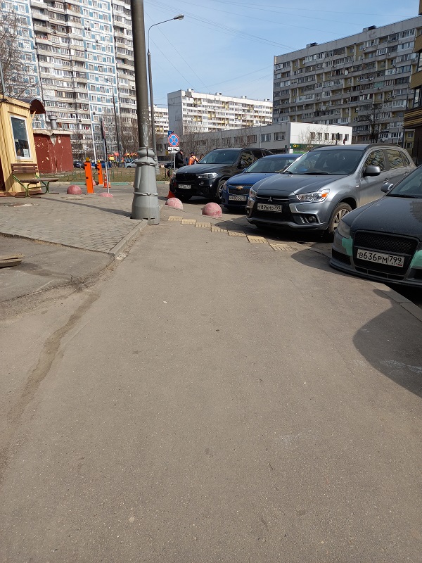 Женщины с коляской в этом месте пройдут, приподнимая коляску на бордюр, а потом опуская с бордюра - им не привыкать, а вот инвалид по зрению, идя по тактильной плитке, заблудится среди полусфер и автомобилей. Во дворе дома некоторые полусферы были сдвинуты для размещения авто, хорошо бы вернуть на место. Можно ещё добавить полусфер в некоторые места.