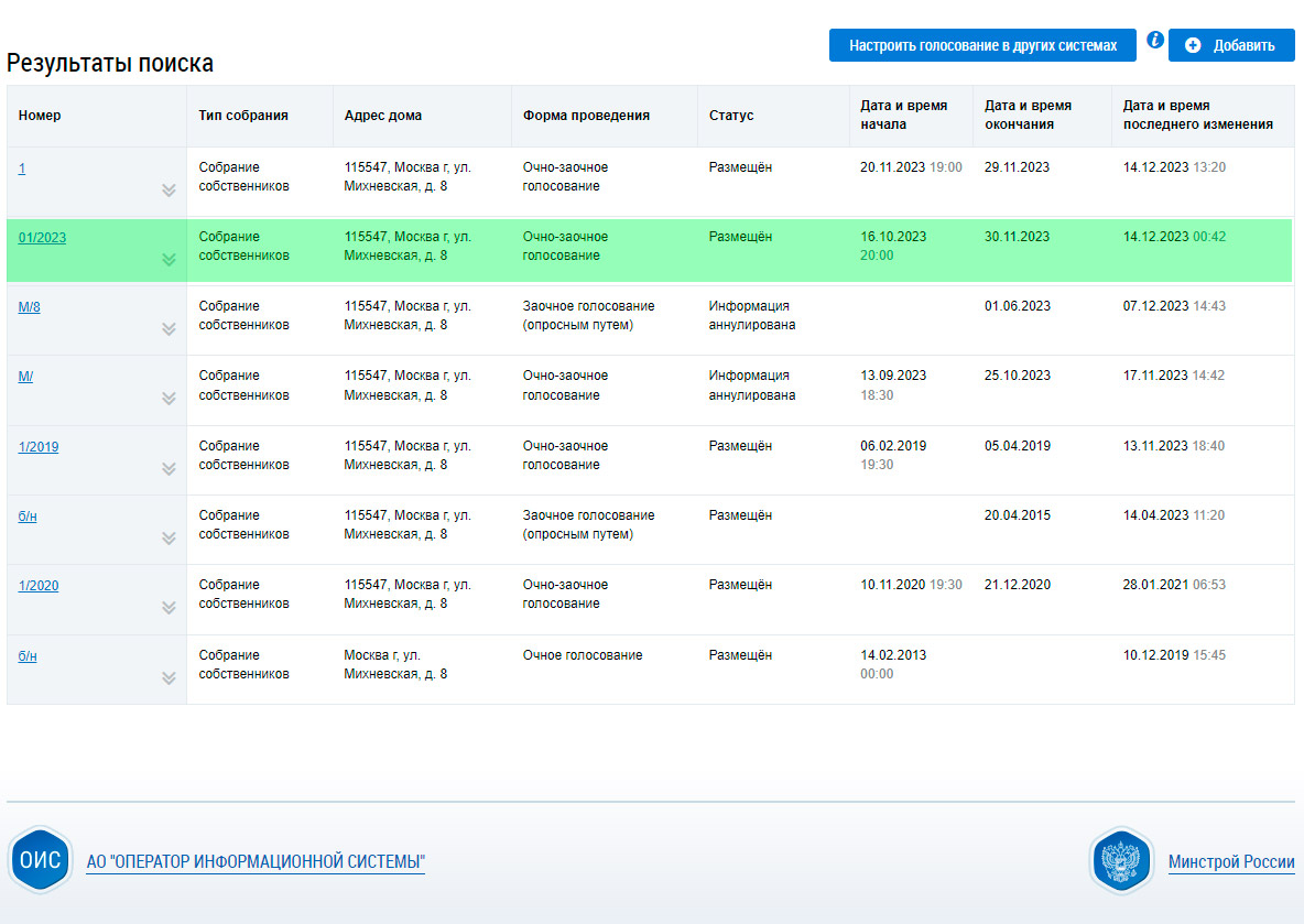Сообщения об итогах собрания, проводимого с 16 октября 2023 года по 30 ноября 2023 года