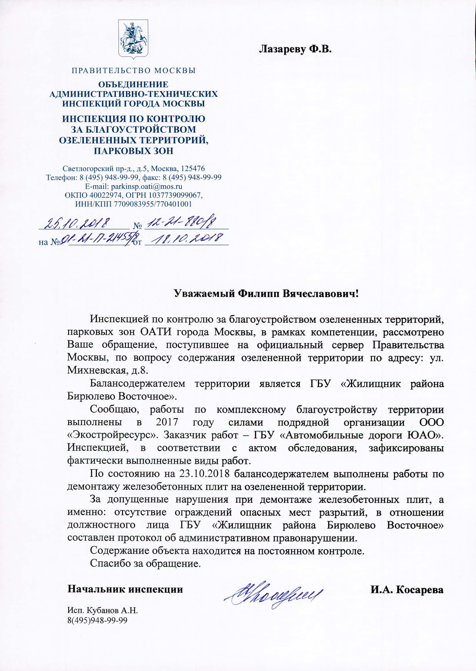 Но секундучку!!! Префектура же уже написала в этом же письме: По состоянию на 17-10-2018 работы по восстановлению газонной части уже выполнены.
