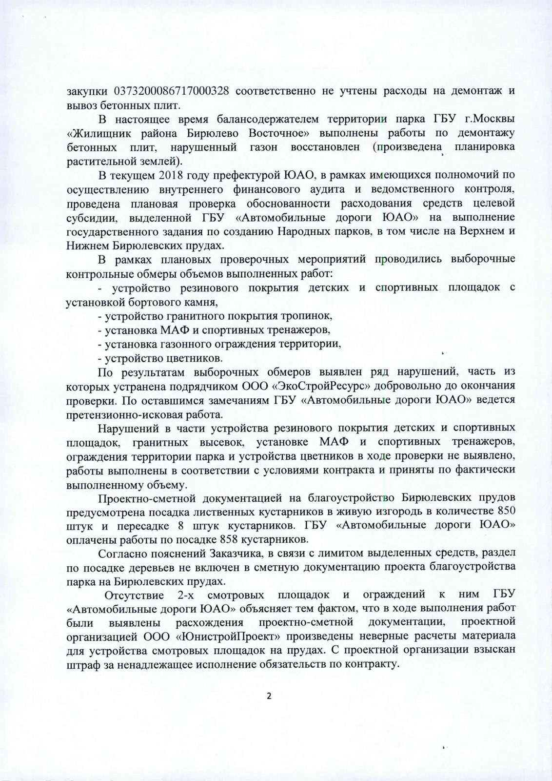 Philipp писал(а):После многочисленных обращений о несоответствии территории Бирюлевских прудов генеральному плану и неполном выполнении работ по благоустройству, получен детальный ответ из Префектуры ЮАО.