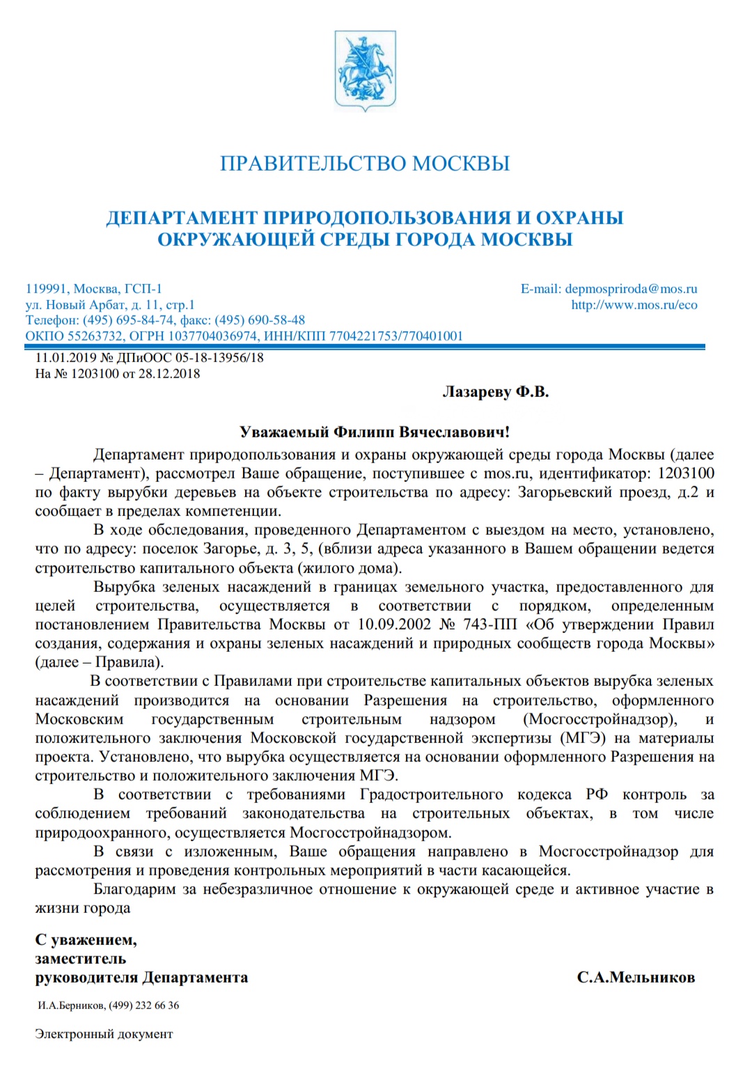 Повторный ответ ДЕПАРТАМЕНТА ПРИРОДОПОЛЬЗОВАНИЯ И ОХРАНЫ ОКРУЖАЮЩЕЙ СРЕДЫ ГОРОДА МОСКВЫ по вырубке деревьев