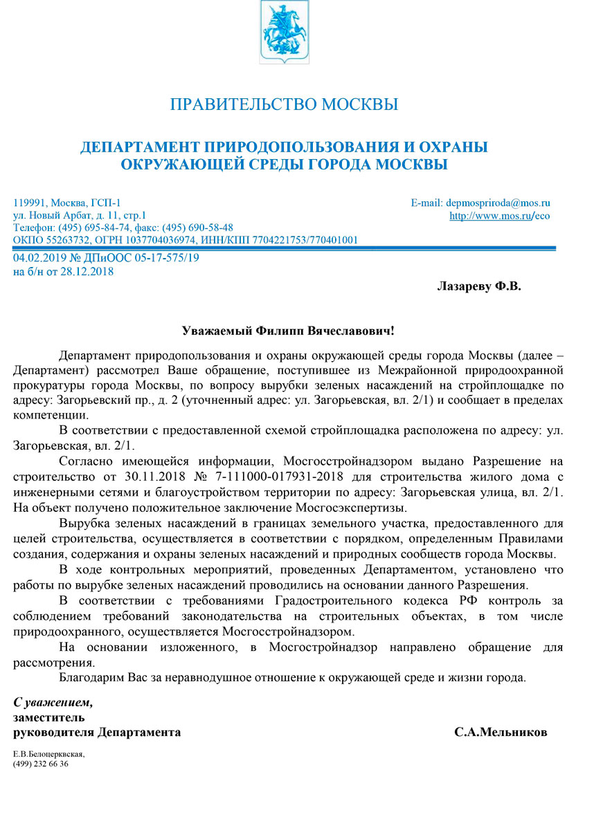 Philipp писал(а):Ответ ДЕПАРТАМЕНТА ПРИРОДОПОЛЬЗОВАНИЯ И ОХРАНЫ ОКРУЖАЮЩЕЙ СРЕДЫ ГОРОДА МОСКВЫ по факту вырубки деревьев и кустарников рядом с нашим домом при строительстве нового МКД.