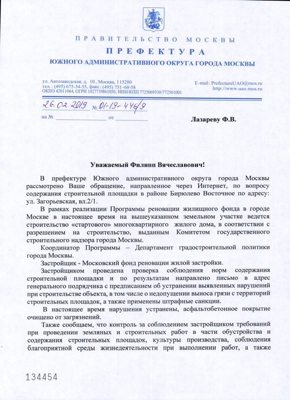 Прошу Вас провести проверку по факту ненадлежащего содержания строительной площадки при строительстве жилого дома по адресу: г. Москва, ЮАО, район Бирюлево Восточное, Загорьевская ул. Вл.2/1.