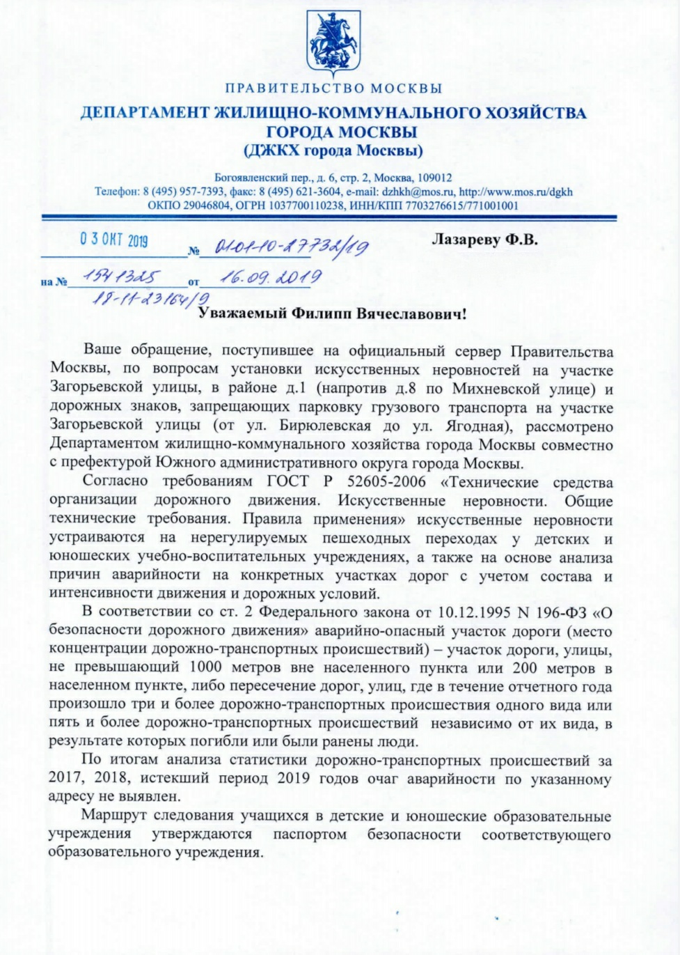 Philipp писал(а):Ранее мной уж отправлялись обращения в гос. структуры с просьбой установить ИДН на нерегулируемом пешеходном переходе на Загорьевской улице рядом с нашим домом, но к сожалению Префектура ЮАО в своих ответах указывает, что нецелесообразно устанавливать ИДН по вышеуказанному адресу в связи с отсутствием очагов аварийности и маршрутов следования к общеобразовательным учреждениям.
