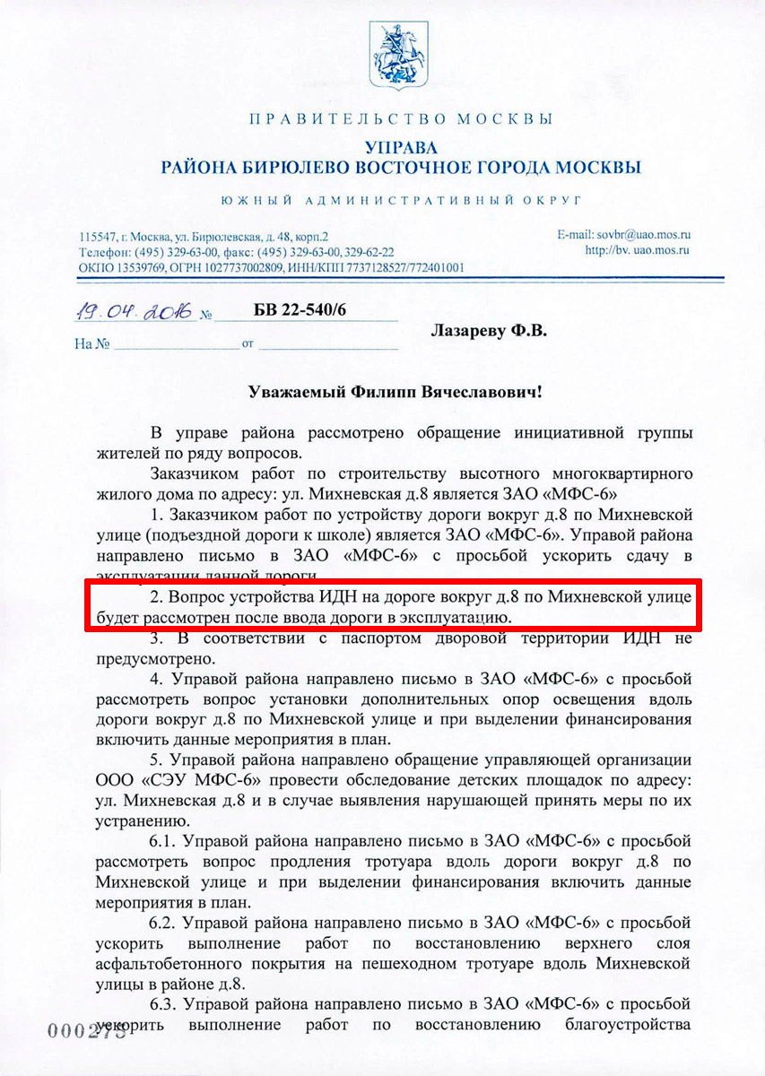 Ответ был следующий: Вопрос устройства ИДН на дороге д.8 по Михневской улице будет рассмотрен после ввода дороги в эксплуатацию.