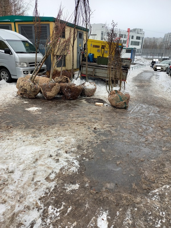 Весна пришла... Продолбили отбойными молотками ямы в земле, привезли деревья, сажают.