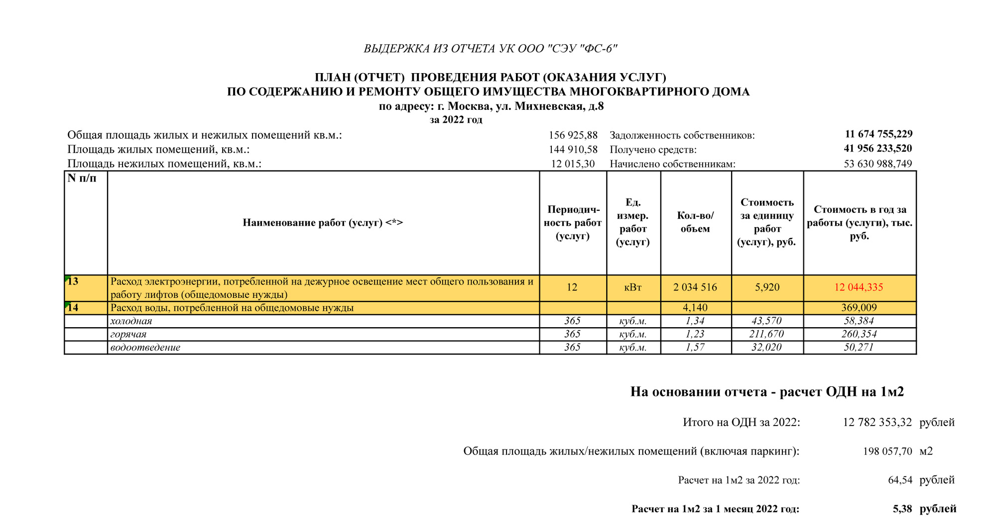 Расчет ОДН на основании данных из отчета ООО УК "СЭУ "ФС-6" за 2022 год