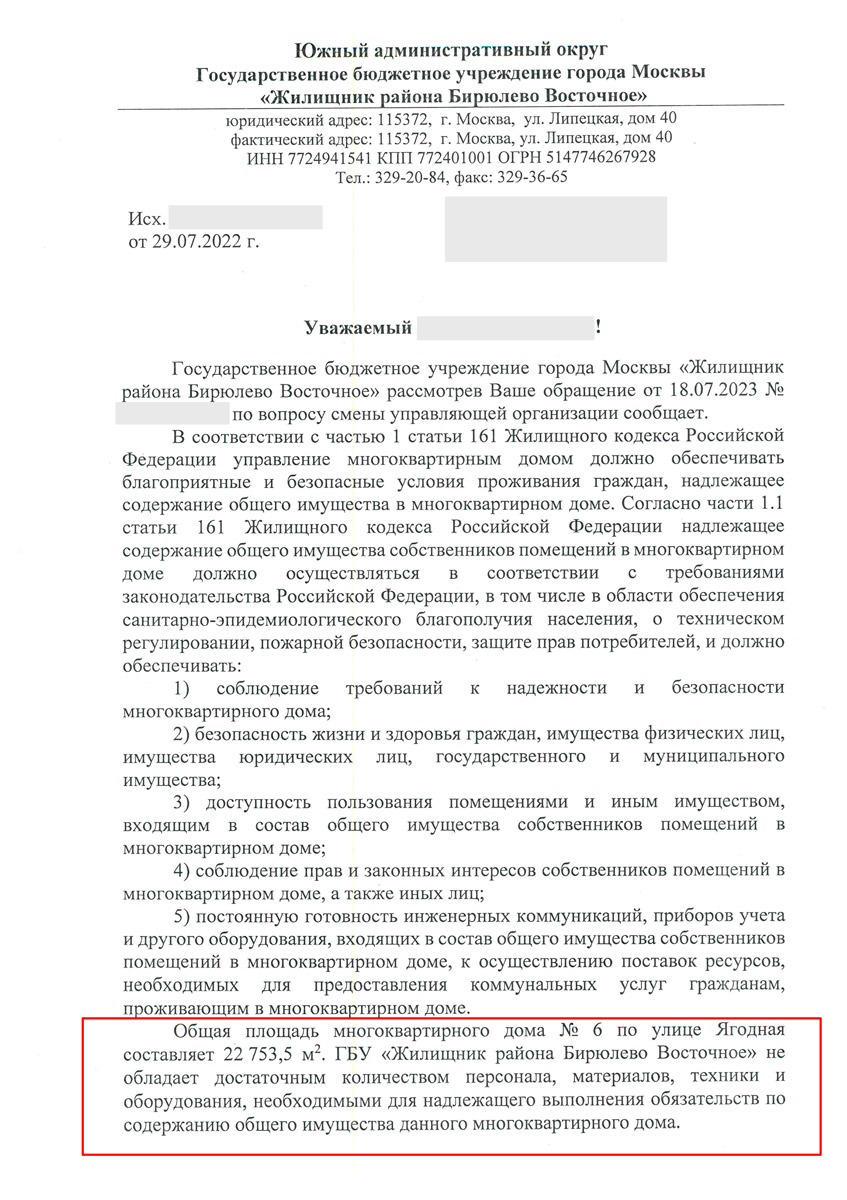 Советом дома рассматривался Жилищник в качестве альтернативной УК. Но проживая в нашем районе и видя состояние соседних домов, было решено отказаться от услуг ГБУ Жилищник. Также в июле 2023 житель дома 6 по Ягодной улице отправил запрос в ГБУ Жилищник, с просьбой рассмотреть возможность взять этот дом в управление. На этот запрос ГБУ Жилищник ответил отказом.