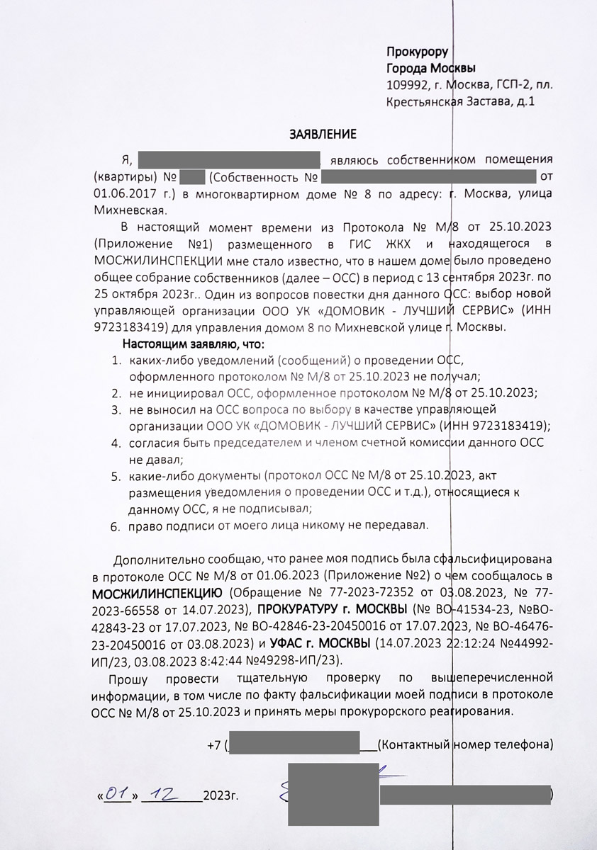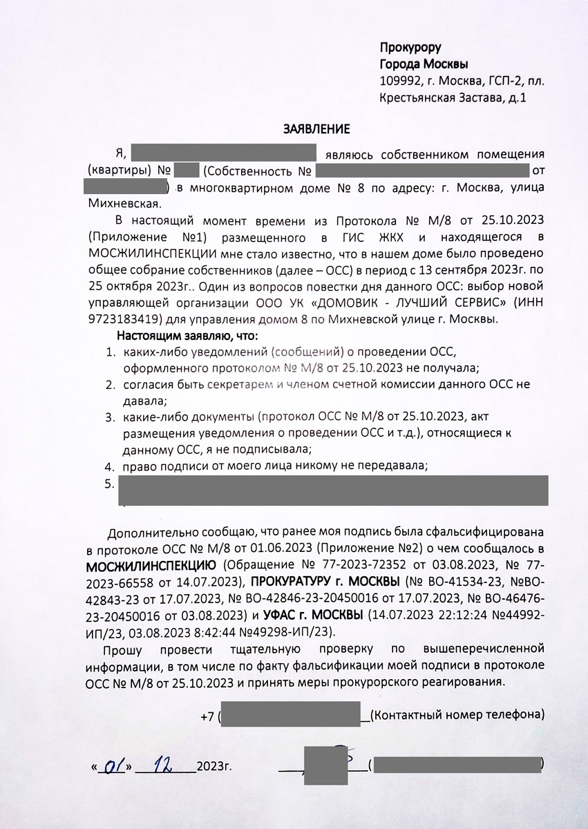 От лица председателя совета дома отправлены обращения в МОСЖИЛИНСПЕКЦИЮ и ПРОКУРУАТУРУ г. Москвы с просьбой проведения тщательной проверки по ОСС оформленному протоколом М/8 от 25.10.23.