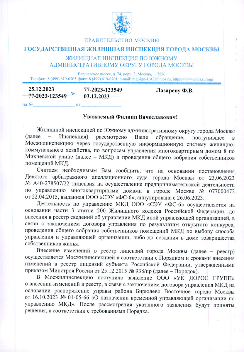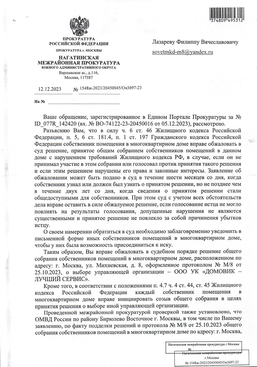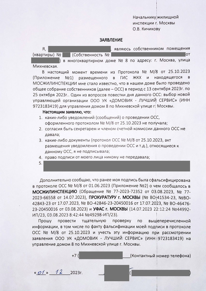 В системе ГИС ЖКХ размещена информация и протокол М/8 от 25.10.23 о том, что в нашем доме (Михневская, 8) с 13.09.2023 по 25.10.2023 было проведено общее собрание собственников, повестка которого - выбор новой управляющей компании ООО УК "Домовик - лучший сервис» (ОГРН 1227700908995, ИНН 9723183419). Также есть информация, что данный протокол находится в МОСЖИЛИНСПЕКЦИИ.