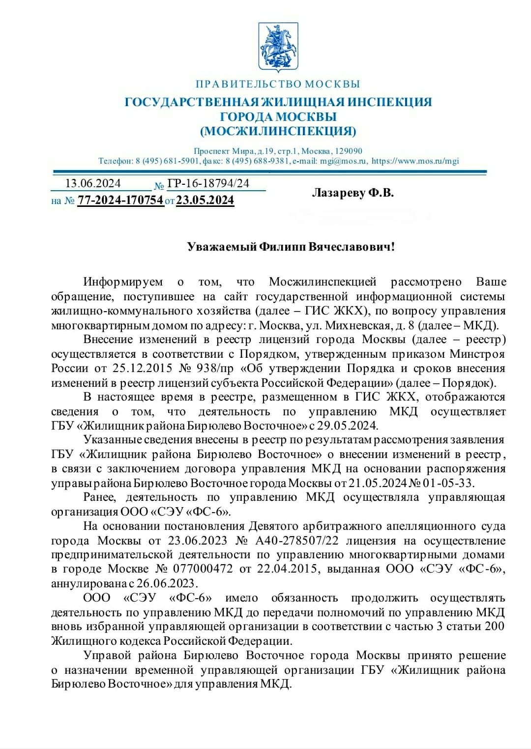28 мая 2024 года, МОСЖИЛИНСПЕКЦИЕЙ по заявлениям ГБУ "Жилищник района Бирюлево Восточное" поданных на основании распоряжения Управы района о назначении временной управляющей организации, принято решение, что с 29 мая 2024 года включить в реестр лицензий города Москвы сведения о том, что ГБУ "Жилищник района Бирюлево Восточное" осуществляет деятельность по управлению многоквартирными домами по адресам: