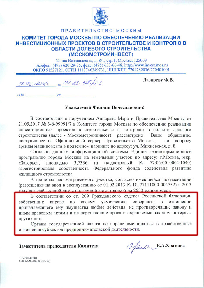 Что сделали-то? Я вот не понимаю, ей Богу. Ребят, ну вы такие интересные, конечно. Вот чуваки собрали подписи, пошли в статус, им сказали, что сдадут тока юрикам. Парни, конечно, молодцы, но как бы про то, что статус готов сдавать в аренду паркинг юридическим лицам всем было известно задолго до сбора подписей. Филипп, Вы же об этом писали в своем письме собянину. Прикладывали там объявление с Авито. И ответ этот Вы написали тут. Это очень здорово, что Вы еще раз об этом всем напомнили, но дело в том, что это ни коим образом ни на миллиметр не продвинуло решение вопроса. То есть ребята что-то делают, тратят свое время и силы, но смысла в этом нет абсолютно никакого. Я у Вас спросил, есть ли документальное подтверждение, Вы ответили, что нет. Так в чем тогда был смысл все это затевать?