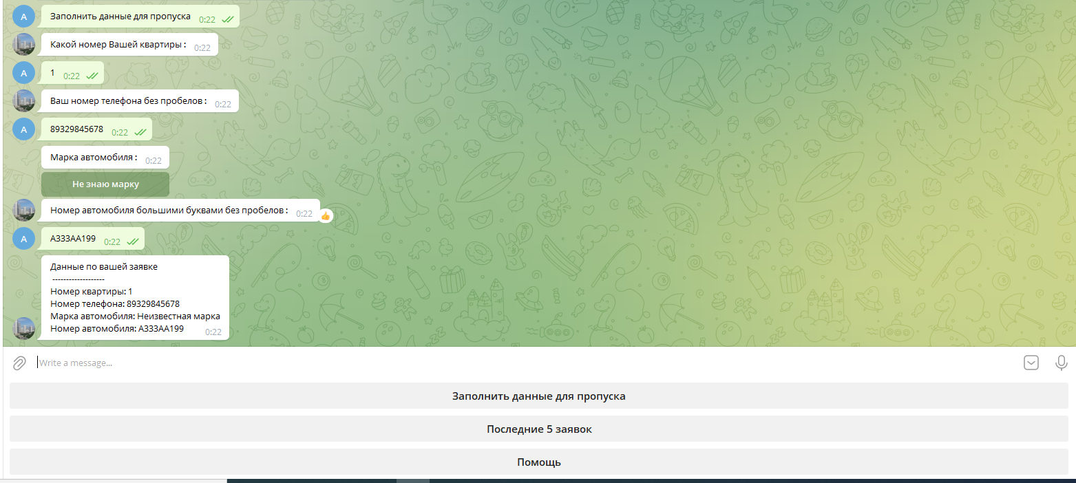 megaultrauser писал(а):Soagshka2 писал(а):Во время своего ремонта я устал заказывать вечно пропуска на разные автомобили в наш дом и придумал такую идею - создать телеграм-бота, в котором можно отправлять заявку на пропуск автомобиля на территорию ЖК.