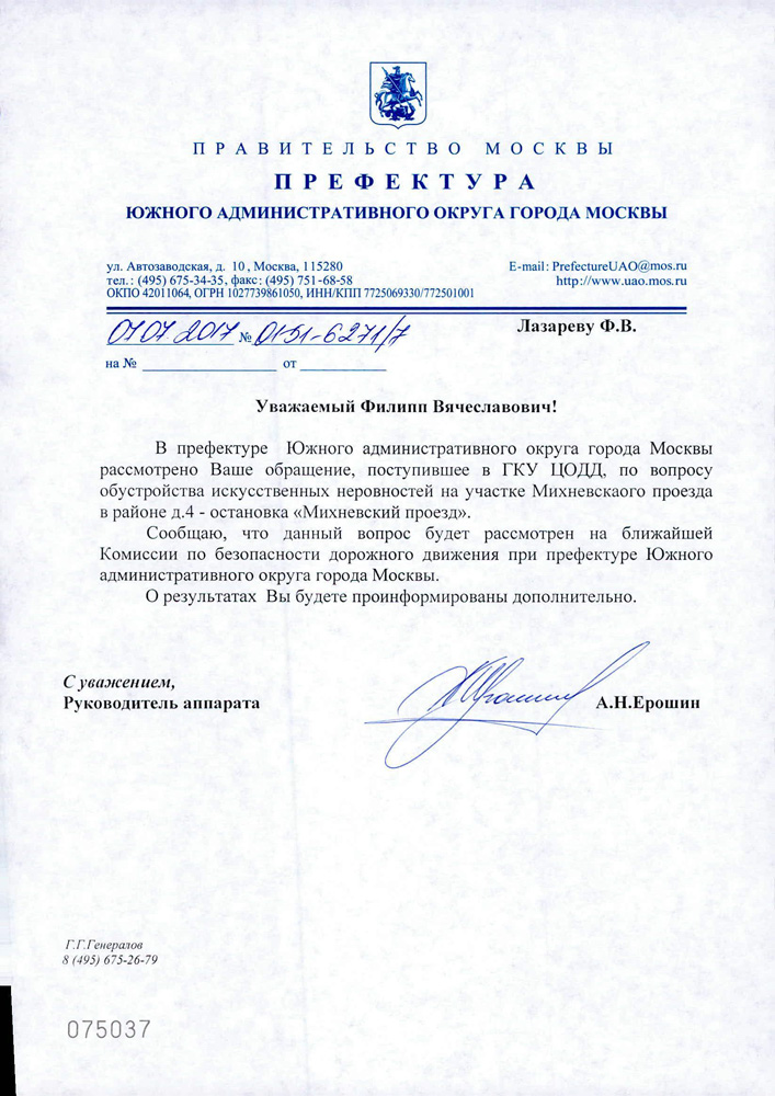 Получен ответ из Префектуры ЮАО и ГИБДД на обращение: