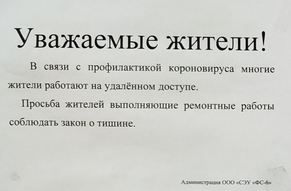 Philipp писал(а):Elena Ts писал(а):На всех подъездах висело объявление «О запрете ремонтных работ в период вынужденной самоизоляции». Плевать все хотели. Стучать, сверлят с самого утра. С ума можно сойти.