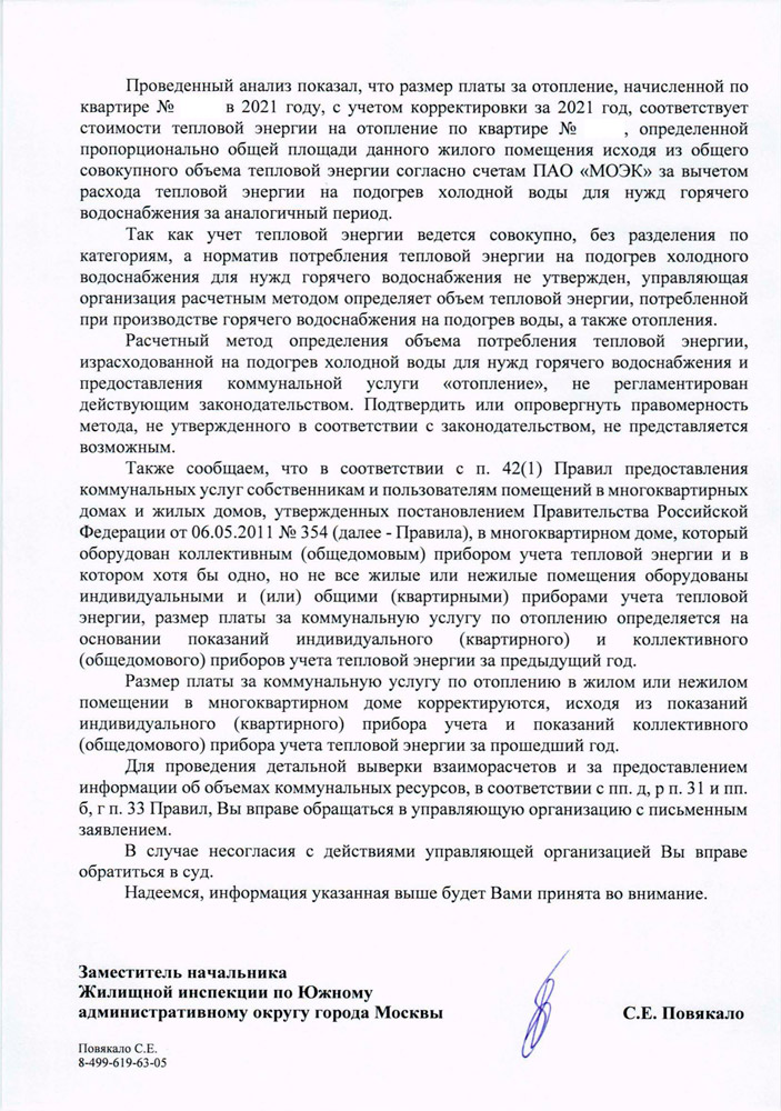 Вот ответ Мосжилинспекции ЮАО на моё обращение по факту перерасчёта за отопление.