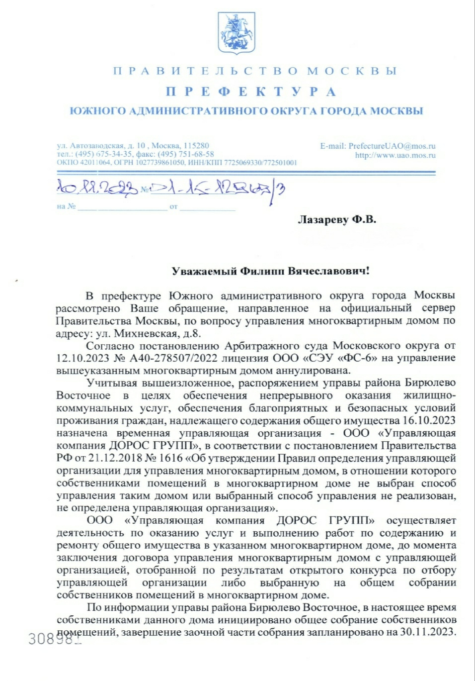 Сегодня получен ответ из МОСЖИЛИНСПЕКЦИИ, ждем ответов из других гос.органов