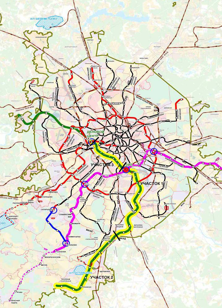 Примечание: На схеме Бирюлевская хорда представлена толстой зеленой линией, при этом основная ее часть выделена желтым цветом (желтым цветом обведены три участка этой хорды: первый участок начинается в районе ЗИЛ, опускается до Бирюлево и заканчивается в районе МКАД, второй участок начинается в районе МКАД и продлевается в районы Новой Москвы - через восточные окраины Северного и Южного Бутово, третий участок начинается в районе ЗИЛ и продлевается в центральные районы Москвы - до Делового Центра (в район Москва-Сити). Оставшаяся часть Бирюлевской хорды продлевается до западных окраин Москвы - от Делового Центра до заМКАДовского Рублево. Исходя из логики данной нумерации можно сделать вывод, что строительство данной хорды предполагается в несколько этапов, с учетом данной нумерации, при этом первый участок хорды - от ЗИЛ до Бирюлево (до МКАД) будет построен в первую очередь, следующий участок хорды будет построен до Новой Москвы и уже после этого хорда будет продлена в центральные районы Москвы - до Москва-Сити. И уже в последнюю очередь хорда будет продлена от Делового Центра до Рублево. При этом, на первом участке Бирюлевской хорды (включающем районы Бирюлево) предусмотрено строительство 9 станций метро, на втором и третьем участве хорды - по 8 станций метро, и на участке от Делового Центра до Рублево - еще 8 станций метро, а всего данная хорда будет иметь 33 станции.