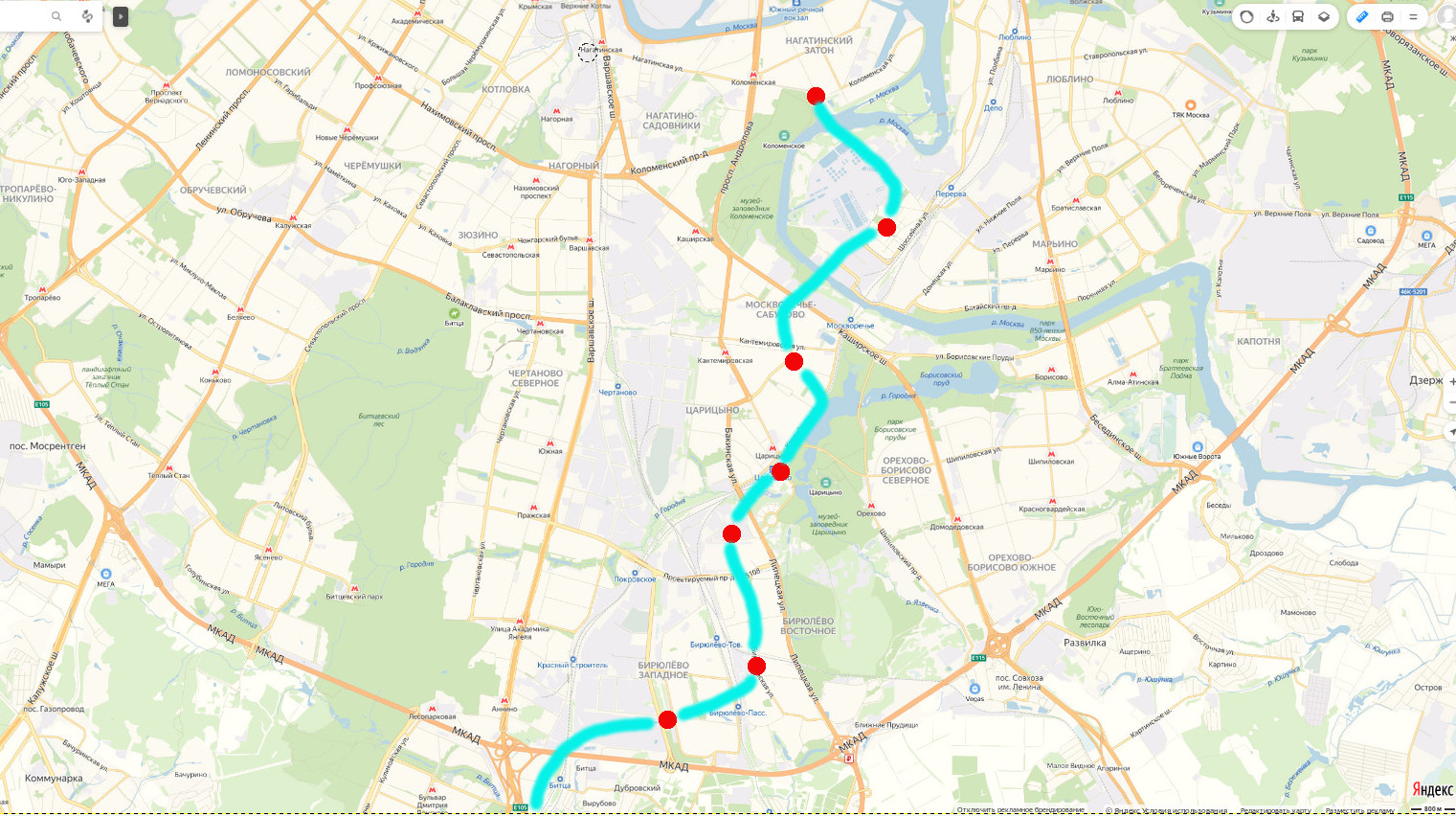 . И с учетом этих данных о нахождении станций метро в Бирюлево, я нарисовал предположительную трассу этой линии метро из Бирюлево до ст. метро "Кленовый бульвар" (с пересадкой на Большую кольцевую линию), с учетом последних офицальных схем на эту тему