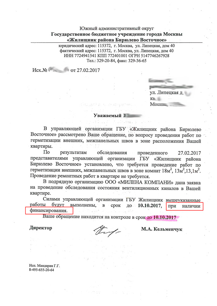 Пример: У людей в квартире постоянно дуло с улицы в результате образовалась плесень, жители обратились в начале 2017 года в ГБУ "ЖИЛИЩНИК". Пришла комиссия выяснили, что проблема не с вентиляцией, а проблема из-за межпанельных швов, но проблему они устранят до 20 октября и только в случае финансирования. То. что данная проблема должна была быть устранена до отопительного сезона им было явно по барабану. Житель с данной проблемой обратился ко мне в результате чего мной было составлено и отправлено обращение в контролирующие органы. Результат: деньги на решение проблемы сразу же нашлись и проблема которую не могли решить 10 месяцев быстро решилась! Вот вам и забота ГБУ "Жилищника" о жителях. те кто не может отстоять свои права так и будут жить в разрухе! Район- району рознь!